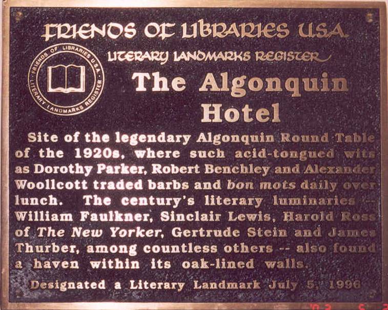 FRIENDS OF LIBRARIES USA [59-63 West 44 Street] Site of the legendary Algonquin Round Table of the 1920s, where such acid-tongued wits as Dorothy Parker, Robert Benchley