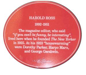 Historic marker on the house at 412 West 47th Street, New York, New York, where New Yorker founder Harold Ross lived. Benchley wrote for the magazine from 1925 to 1940. Design: David Trumbull RETURN TO SOB | RETURN TO HOME |